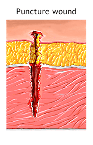 What’s important to know about puncture wounds is that as you can see from this diagram below, the penetrating wound is V-shaped. It heals from the bottom up. Because it heals from the bottom up, if the bacteria is trapped – it is likely to cause an abscess. Therefore, when treating puncture wounds, there are several factors to take into account:
